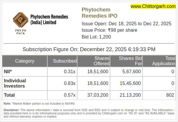 Phytochem Remedies IPO subscribed 0.57 times. The public issue subscribed 0.83 times in the individual investors category, [.] times in QIB (Ex Anchor), and 0.31 times in the NII category by December 22, 2025 6:19:33 PM (Day 3).